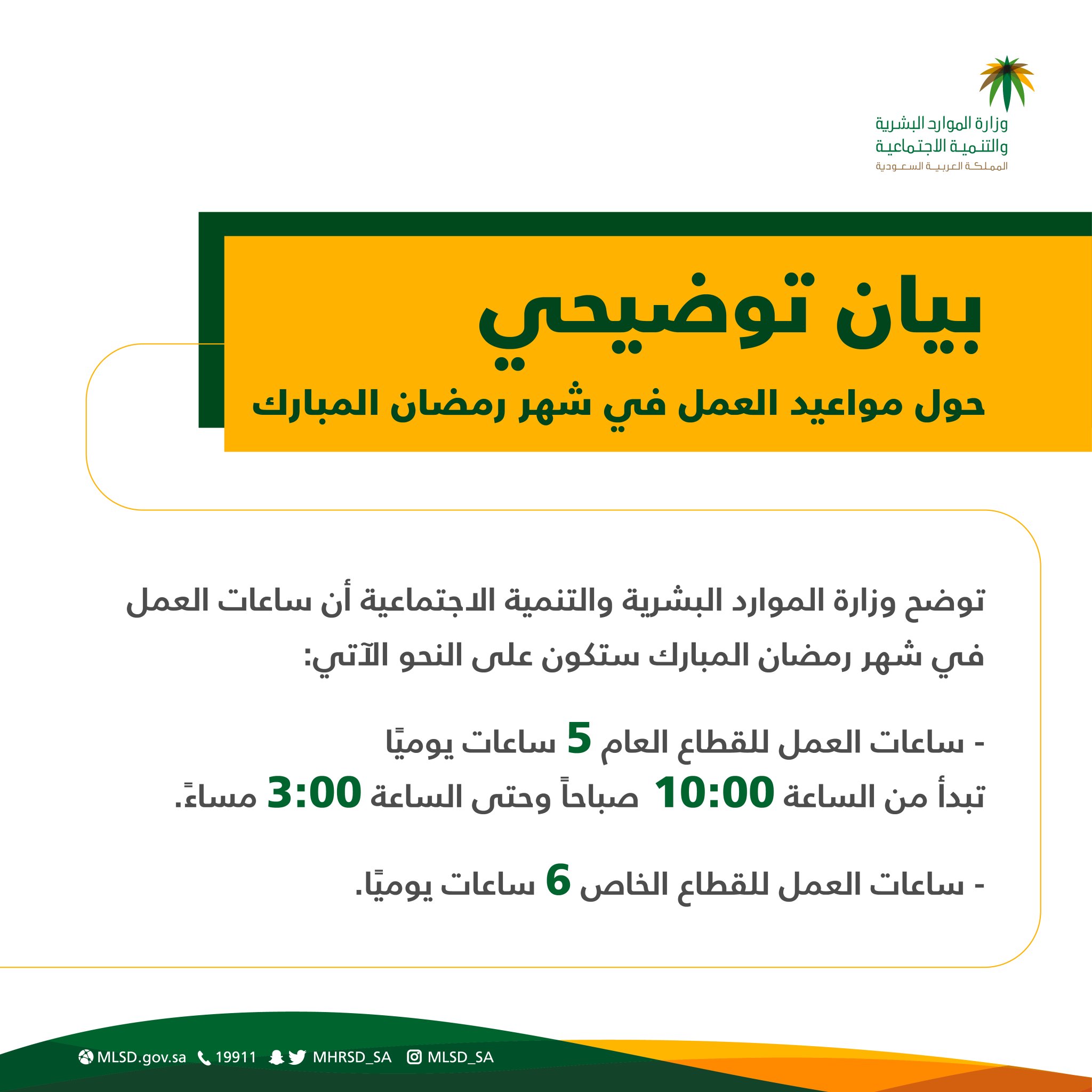 نظام العمل السعودي On Twitter مواعيد العمل في شهر رمضان المبارك ساعات العمل للقطاع العام 5 ساعات يوميا ساعات العمل للقطاع الخاص 6 ساعات يوميا Https T Co T6vduwwnsm